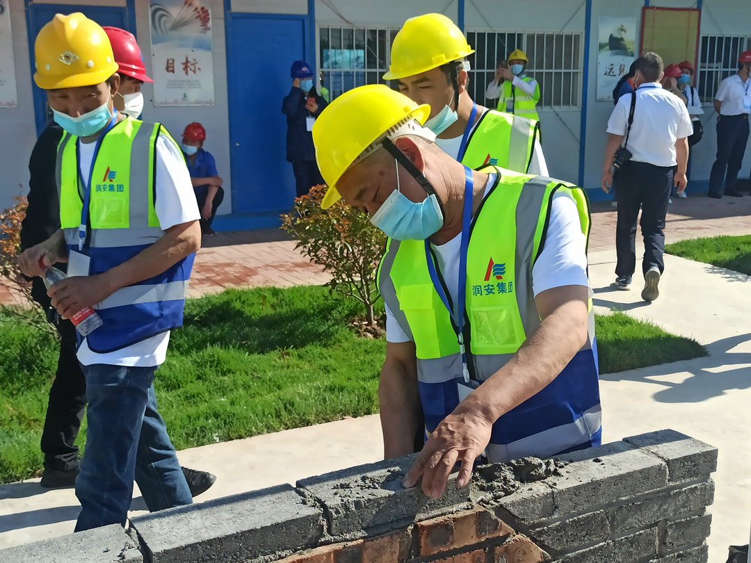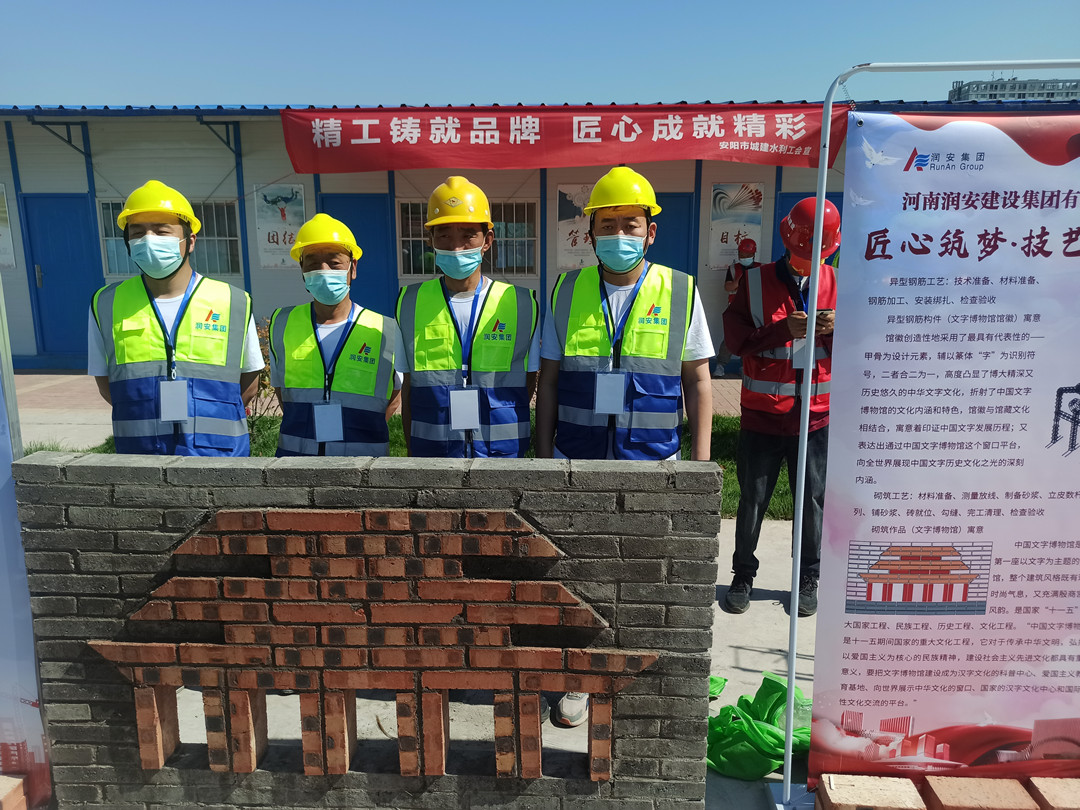 本次技能展示活動設(shè)置了鋼筋綁扎和砌筑兩個項目,我公司派遣八名職工代表參加了本次技能展示,選手們身著統(tǒng)一工作服,以嫻熟的操作技能展現(xiàn)了過硬的技術(shù)水平。砌筑工速度與質(zhì)量并重,一手拿著泥刀,一手不停地一塊塊砌磚,每一道工序、每一個細節(jié)都力求做到完美,最終圓滿完成了砌筑作品《文字博物館》。鋼筋工粗中有細,在大面積作業(yè)的同時,即時進行細節(jié)處理,確保作品垂直、平整,經(jīng)過一系列的復(fù)雜操作,一個完美的安陽文字博物館館徽便呈現(xiàn)在眼前。高超的技藝水平贏得了領(lǐng)導(dǎo)和現(xiàn)場觀眾的一致稱贊。