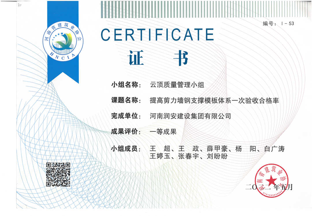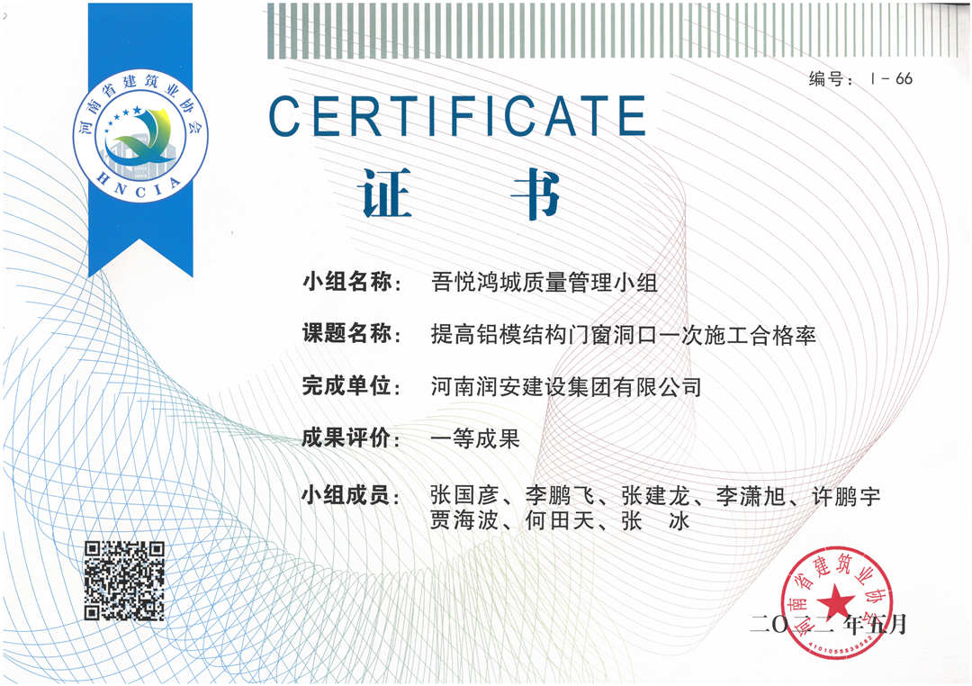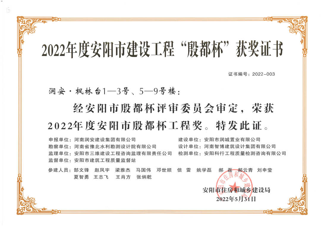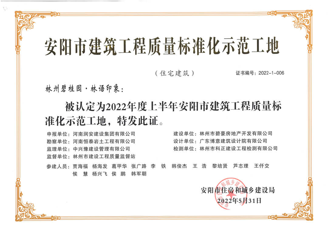 近期,集團(tuán)公司承建的多個項目捷報頻傳,先后有“林州碧桂園?林語印象項目”,被評為2022年上半年安陽市建筑工程質(zhì)量標(biāo)準(zhǔn)化示范工地;潤安楓林臺1-3、5-9號樓、林州碧桂園?天璽7號樓榮獲2022年度安陽市殷都杯工程獎。同時,吾悅鴻城質(zhì)量管理小組、云頂質(zhì)量管理小組、璽悅質(zhì)量管理小組申報的三項課題均被河南省建筑業(yè)協(xié)會評為一等成果。